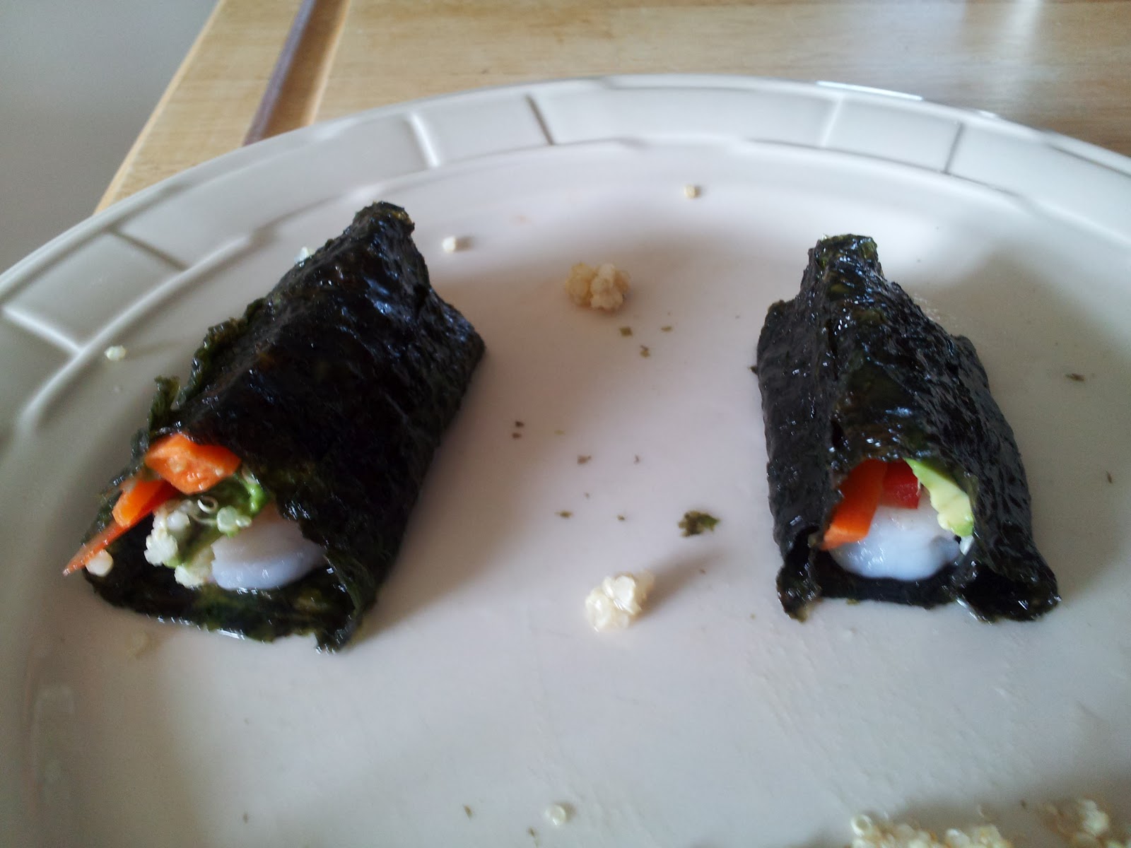 After weeks of sitting in the pantry, a creative juice finally flowed and here is our result: dampened nori, quinoa, shrimp, raw bell pepper & carrot and avocado to top it off.